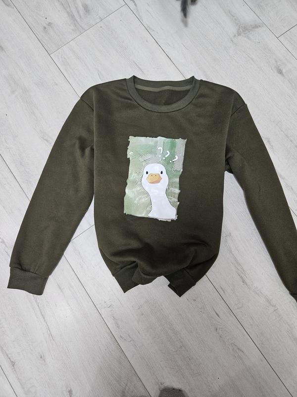 теплое на флисе худи, оливкового цвета. с веселым рисунком. размер s, m Shein.