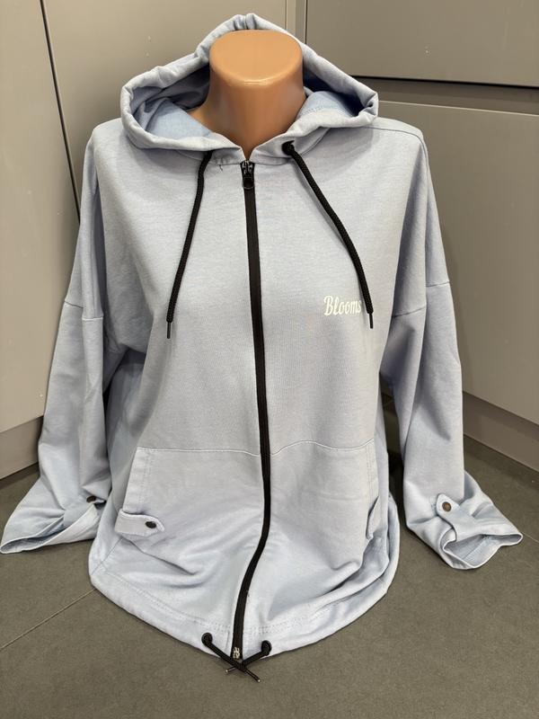 капюшон и низ регулируется завязками нежный голубой-сиреневый цвет карманы и рукава украшает хлястик с кнопкой (рукава регулирует) молнию при застегивании следует слегка прижимать пальцем ОГ 57 ОБ 60 рукав приспущений: от шва 42 от ворота 69 длина 68 нюанс: возле кнопки пятнышки как ржавчина (последняя фото)
