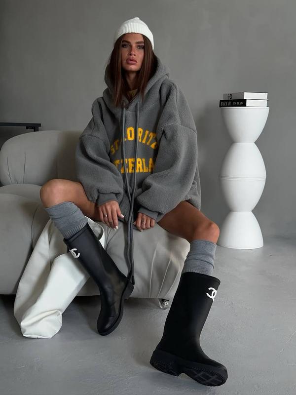 Худи надпись капюшон оверсайз флис тедди барашек кармана мини платье