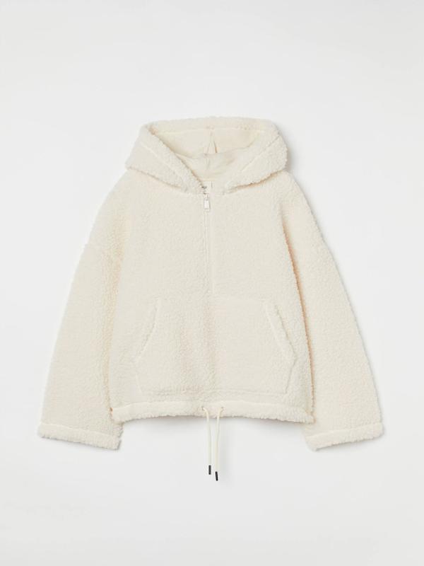 П.. Свободного кроя худи с капюшоном из мягкой искусственной овчины. Капюшон на трикотажной подкладке, полумолния и карман кенгуру. Спущенные плечи, длинные рукава и шнурок на подоле для регулируемой посадки. ***Размер - M Полуобхват пояса - 64,00 см Длина рукава - 46,00 см Длина изделия - 59,00 см Ширина по плечах - 63,00 см Объем груди - 124,00 см Состав: 100% полиэстер