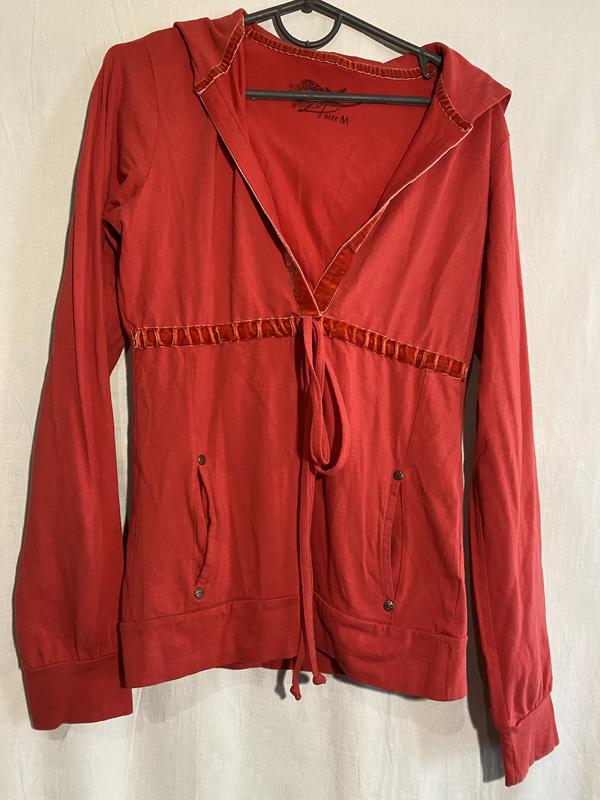 Кофта червона довжина 62 у грудях напів ох ват 44 рукав довжина 69 вот талії 35 по низ 41
