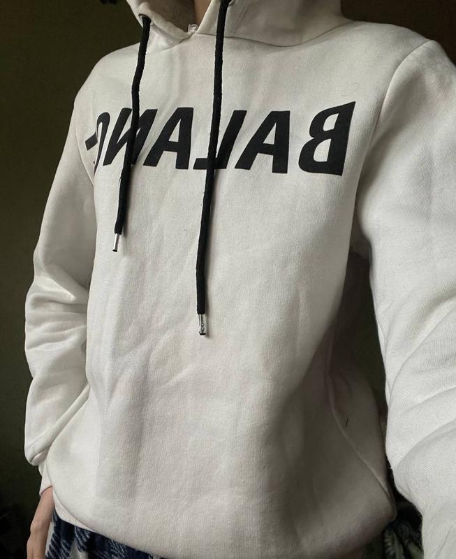 Опис: Тепле біле худі на флісі, розмір S, з чорним написом «Balenciaga» по центру (не оригінал, стильна копія). Дуже м’яке й тепле. Матеріал: 80% бавовна, 20% еластан — приємне до тіла, добре гріє. Посадка: Зручне, об’ємне, добре тримає форму. Деталі: Капюшон, зав’язки, чорний напис по центру, м’який фліс усередині. Стан: Хороший, без явних дефектів, 10/10 Буду рада відповісти на ваші питання в директі🎀