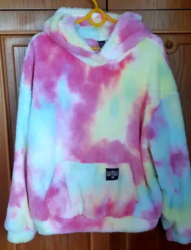 модная худи плюшевая байка ТАЙ ДАЙ с разноцветным принтом с капишоном карманами осень зима долж61 рукав от шеи75 грудь62 низ52
