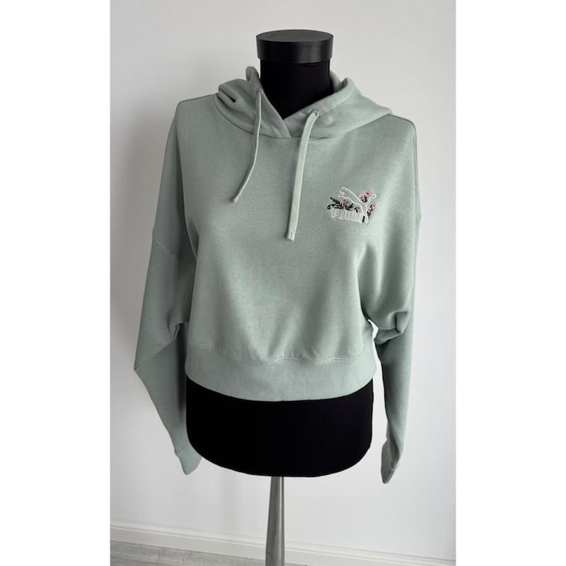 Жіноче бавовняне укорочене худі з капюшоном мʼятного кольору. Вишитий логотип з квітами