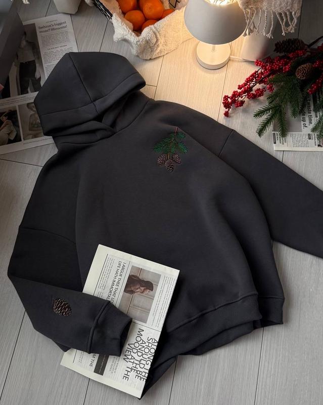 Атмосферне жіноче худі оверсайз на флісі з манжетом по низу та гарною вишивкою у вигляді м...