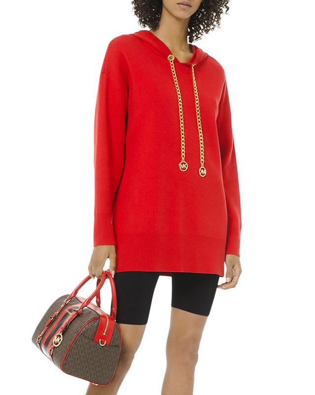 Червоний хлопковий 100% уотон худі щільної в'язки, теплий, приємний до тіла, зігриває але не колиться як вовна. Має декор золоті ланцюги-зав'язки, це головна його фішка, дуже яскрава витончена незвична деталь, худі можно вдягнути навіть як на повсякден, так і на вихід. Е капюшон гарної форми, не в обліпку. Надягнут раз, не мій колір.