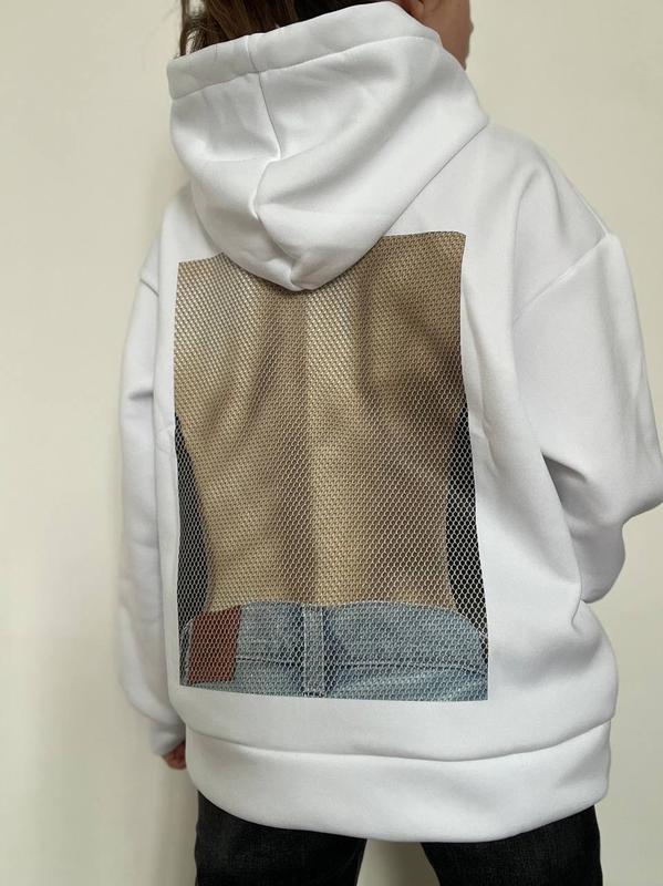 Худі тренд сезону,на спині наклейка з малюнком із імітацією відкритої спинки,на флісі,розмір S-M