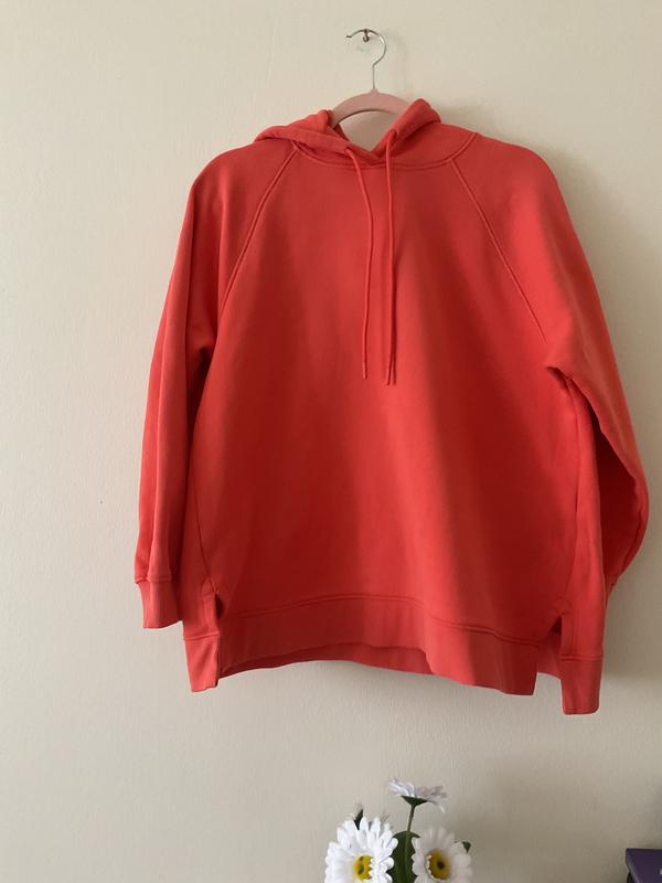 Худи женское на 48-50 размер. Яркое, с капюшоном. По бокам разрезы. Замеры: рукав реглан, между подмышками 60 см, длина 67. Плотный хлопок. Без дефектов.