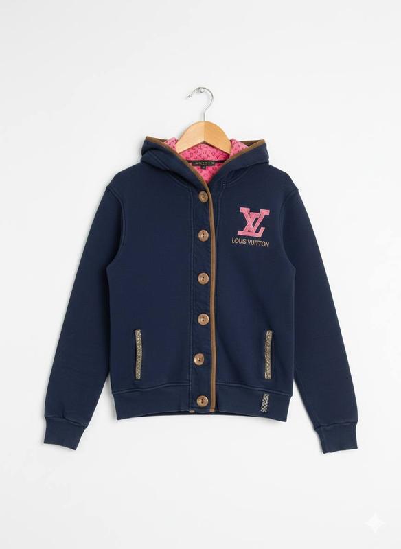 - Плечі : 45 см - Груди : 50 см - Рукав : 62 см - Довжина по спині : 58 см Продаю дуже затишну та яскраву кофту темно-синього кольору. Модель поєднує в собі комфорт спортивного худі та оригінальний дизайн. Чудово підійде для прогулянок або повсякденного носіння. Основні характеристики: • Колір: Глибокий темно-синій з яскравими рожевими та коричневими акцентами. • Деталі: Капюшон та логотип мають внутрішню підкладку з фірмовим принтом (Monogram) у рожевому кольорі. • Застібка: Надійна планка з великими коричневими ґудзиками з написом бренду. • Кишені: Дві бічні кишені, оздоблені декоративною стрічкою. • Матеріал: М'який та приємний на дотик трикотаж, рукави та низ на щільних манжетах. Стан та розмір: • Розмір: M-L • Стан: Дуже хороший. Тканина зберегла колір, манжети не розтягнуті, всі ґудзики на місці. Переваги: ✅ Яскравий дизайн, що привертає увагу. ✅ Контрастна рожева підкладка в капюшоні. ✅ Зручний крій, що не сковує рухів. ПИШІТЬ , ДОМОВИМОСЬ :)