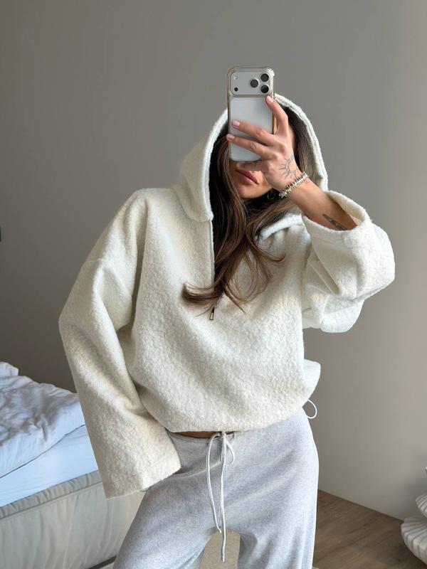✨ Худи из букле – стиль и комфорт в каждой детали ✨ Мягкие, уютные худи из текстурной ткани букле - идеальный выбор для прохладной погоды. Модель имеет удобный большой капюшон короткую молнию спереди и кулиски в конце длины изделия |тканина:букле | цвет:молоко и черный | размер:42-46 |мод:608
