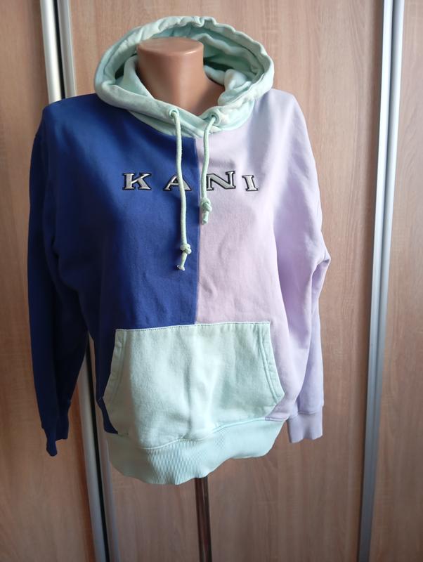 Худи выполнено в стиле color block (цветовые блоки), сочетающем синий, сиреневый (лиловый) и мятно-зеленый цвета. Детали: Присутствует большой вышитый или печатный логотип "KANI" на груди, карман-кенгуру и капюшон с завязками мятного цвета. в капюшоне есть небольшой ньюанс на фото,на внешний вид не влияет