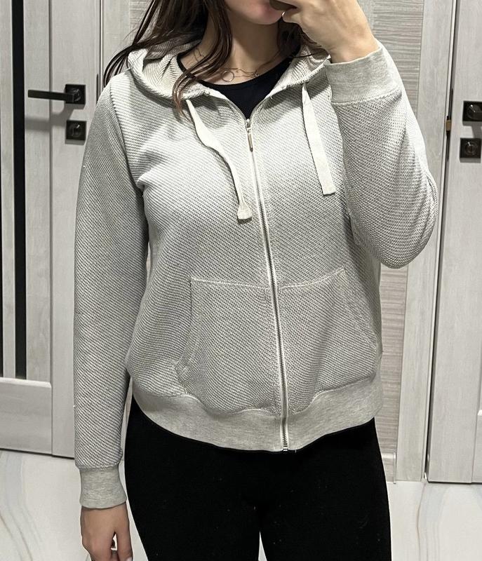 Продам зручну та практичну кофту з капюшоном (zip-up hoodie) New Look. Завдяки нейтральному світло-сірому кольору та текстурній в'язці, вона стане ідеальним варіантом для повсякденних образів або занять спортом. Стан: Вживана (б/в), стан хороший, блискавка працює плавно, манжети не розтягнуті. Особливості: Фактурна тканина (дрібна клітинка/піке), зручні накладні кишені-"кенгуру", глибокий капюшон на затяжках. Стиль: Приталений крій, що гарно сідає по фігурі. Заміри: Розмір: S-M Довжина по спинці: 55 см Довжина рукава: 60 см