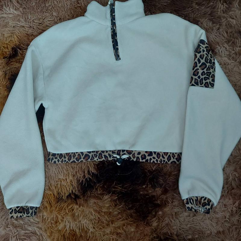 Женская флисовая кофтина укороченная. Украшена леопардовыми вставками. Длина изделия 45 см Длина рукава 54 см Длина груди 50 см