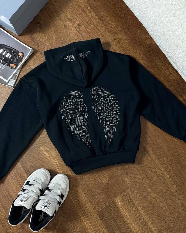 Фото РЕАЛ💎 Худі 🪽🪽 Код 290 Тканина: трьохнитка на флісі + каміння(стрази) Розмір: 42-46 оверсайз Кольори: сірий меланж, чорний, рожевий, чорний з чорним 💵Ціна 970 грн 🔥 Обʼємний оверсайз худі з крилами на спині, з камінчиків. Приємна мʼяка тканина. Має кишеню кенгуру.розал