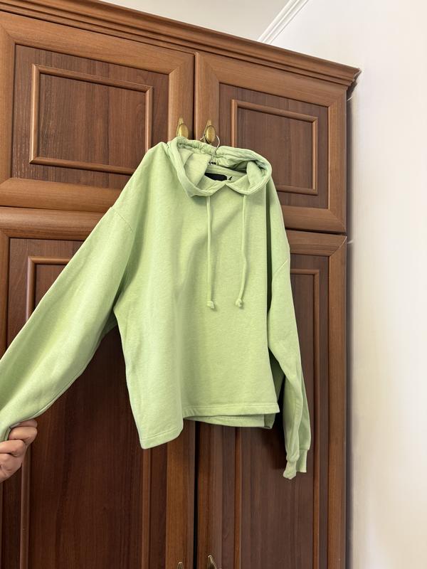 Укорочене худі в ніжно-салатовому кольорі 🌿 Стильна базова модель вільного крою. Худі має об'ємний капюшон зі шнурками та еластичні манжети на рукавах. Ідеально поєднується з джинсами або джогерами на високій посадці. Заміри: • Обхват грудей: 130 см (оверсайз) • Довжина: 58 см (укорочений фасон) • Рукав: 55 см (до витки)