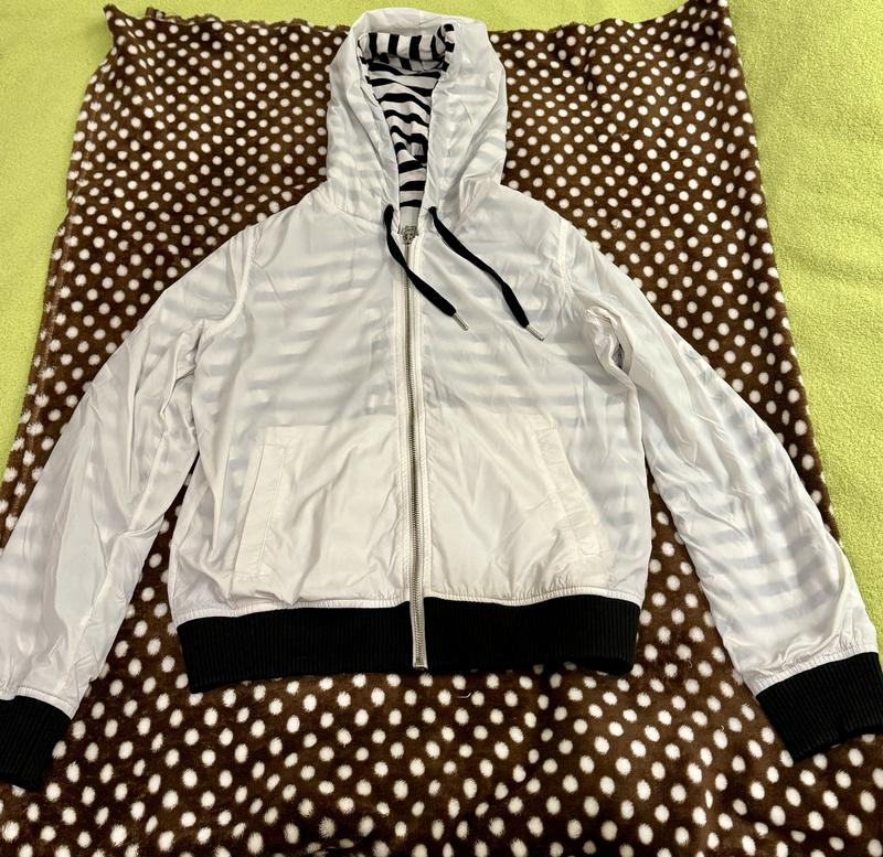 Стильна та функціональна річ, що додасть динаміки вашому гардеробу. Головна «фішка» — поєднання напівпрозорого білого верхнього шару та класичної чорно-білої смужки всередині, що створює цікавий візуальний ефект. Основні характеристики: • Бренд: LTB (оригінал). • Розмір: XS (ідеально сідає по фігурі). • Дизайн: Двошарова конструкція — тонка біла тканина зверху + трикотажна підкладка в горизонтальну смужку. • Деталі: * Контрастні чорні манжети та нижня резинка для кращої фіксації. • Зручний капюшон із регульованими чорними шнурками. • Якісна металева застібка-блискавка. • Дві функціональні передні кишені. Ця модель ідеально підходить для міських прогулянок чи вечірніх пробіжок. Вона захищає від легкого вітру, залишаючись при цьому максимально дихаючою. Чорно-біла гама робить її універсальною: вона однаково круто виглядає і з базовими джинсами, і зі спортивними джогерами. Завдяки тонкому верхньому шару, кофта майже не мнеться — ідеальний варіант, щоб закинути в рюкзак «на всякий випадок».