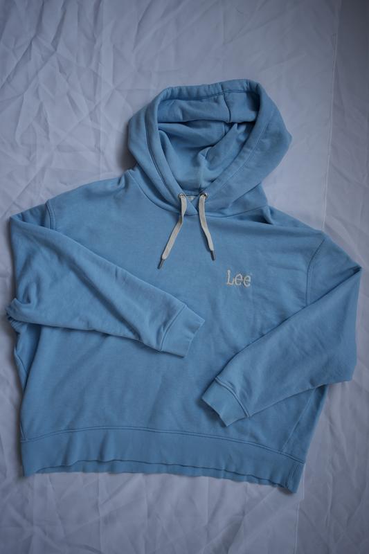 Худі в блакитному кольорі, розмір L, але гаврно підійде на розмір s/m, буде в стилі оверсайз. Стан дуже хороший!)