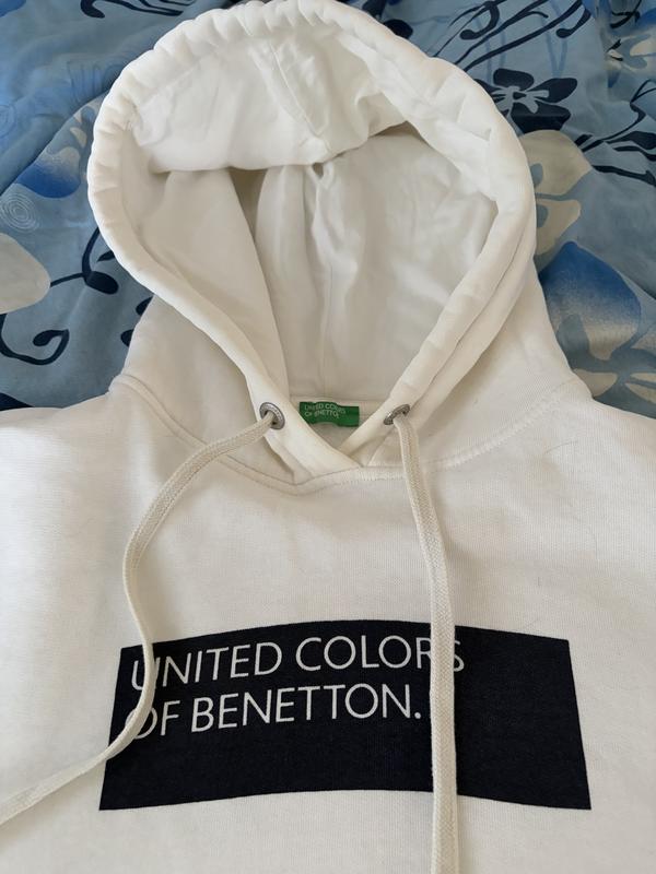 Худи United Colors of Benetton в белом цвете с характерным черным логотипом на груди. Основные характеристики: Тип: Худи (толстовка с капюшоном). Бренд: United Colors of Benetton. Детали: Капюшон на завязках, эластичные манжеты и нижний край в рубчик. Материал: мягкий хлопковый трикотаж, немного с добавлением полиэстера для лучшей посадки, подкладка флис. Европейское качество, носилось мало, куплено в официальном магазине в Париже.