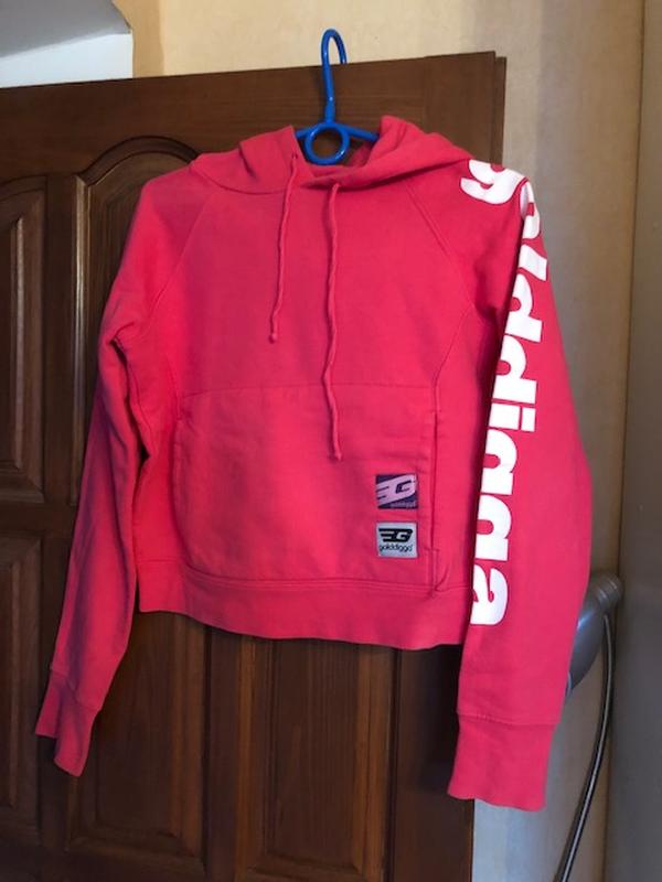 Яркий реглан Golddigga, Англия, р-р XS. В отличном состоянии, без нюансов и замечаний. Цвет ярко – розовый, фуксия. Капюшон, карманы, надпись на рукаве белого цвета. Состав: 100% коттон. Замеры: длина 49 см, ПОГ 50 см, ПОТ 47 см, низ 44 см, рукав реглан: от шеи 72 см, от подмышки 58 см.