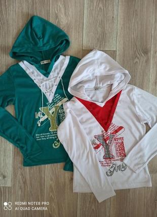 Кофточки новые, не ношены. Цвет: зеленый, белый. ЦЕНА указана за 2 шт. Невероятно нежные и мягкие на ощупь. Ткань: 80% хлопок, 20% полиэстер. В одной отсутствует белый шнурок. На наш 44 размер (на меньший тоже подойдут). Замеры кофты: - длина по спинке 53 см; - длина рукава от плеча 57-58 см; - ширина по плечам 38 см; - ширина от подмышки до подмышки 42 см