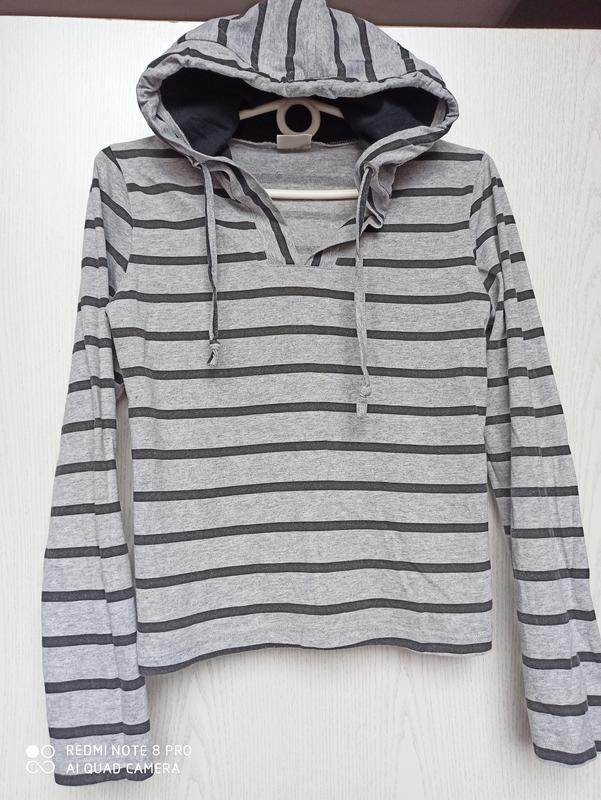Удобная и стильная вещь. Легкая хлопковая с примесью полиэстера ткань в серо-черных тонах. Цвет на фото может немного отличаться от оригинала. На 3м фото как пример подобной модели. Размер указан 12, можно 10-8 (см. замеры). Плечи 40 см, ПО под рукавами 45 см, ПО внизу 44 см, длина 51 см, длина рукава 60 см. Капюшон объемный, высотой 34 см. Стан добрый, местами есть катышки ( последние 2 фото).