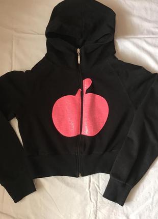 Продам укороченный худи с капюшоном, на замочке, вставка с яблоком, украшено паетками. Состояние идеальное. Размер XS-S Пересылаю почтой