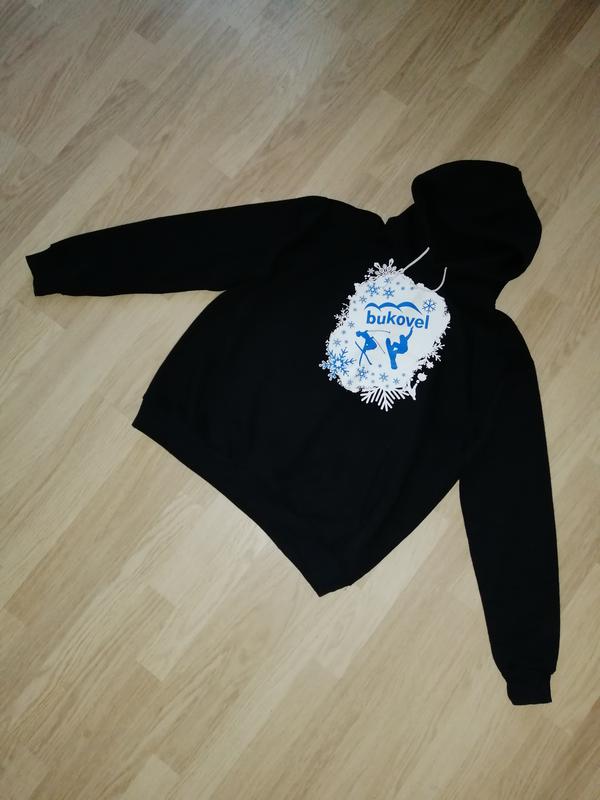 Худі чорна на флісі з капюшоном, тепла, трехнитка. Щільна, м'яка, приємна. Дуже хорошої якості. З аплікацією "Буковель". Можна на сувенір. Одягнена один раз. Стан нової. Заміри : Довжина - 68 см Рукав - 64 см Плече 16 см П. Обхват грудей 62 см Вниз на манжеті обхват 100 см