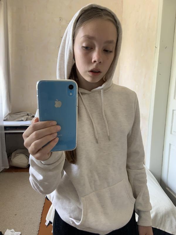 Оверсайз худи в бежевом цвете. Состояние было б идеальным если бы не недочёт на рукаве. Его совсем не видно, и можно легко зашить, так что на этом не стот зацыкливаться. А худи удобный. Размер маленький. Если хотите чтоб он сидел оверсайз то девушкам стройного телосложения подойдёт, или низкого роста.