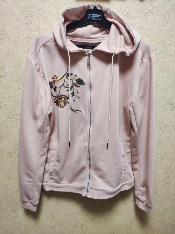 Кофта нежно -розовая на молнии ,вышитый принт .С капюшоном