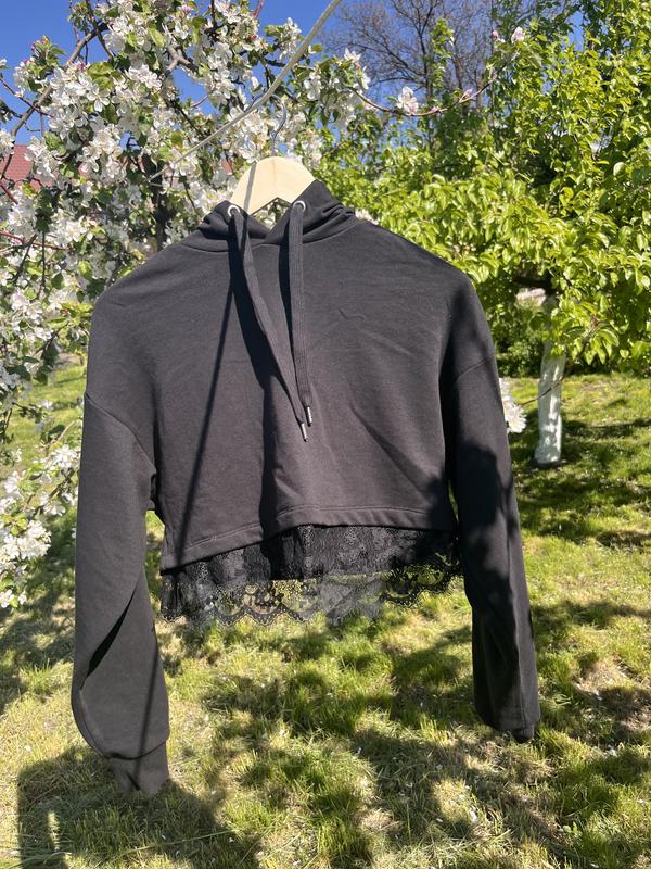 В хорошем состоянии чёрное укороченное худи с кружевом, кружево легко выпаривается если не нравится. Размер xs. На фото пересвет от солнца, цвет равномерно, насыщенно чёрный. Не тёплое.