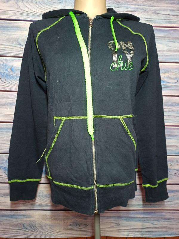 На молнии. Очень удобная и качественная модель. Размер указан L, но маломерит. Рукав -реглан 70 см от горловины, ПОГ 47см, длина по спинке 61см.