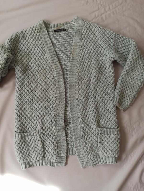 Кардиган грубої в'язки. Колір м'яти,не передається на фото. Стан хороший, є незначні катишки. В складі є 10% шерсті