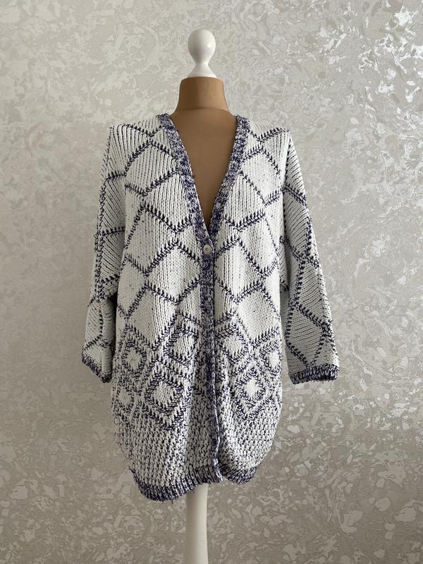 Стильний якісний кардиган від Claudia Sträter (Нідерланди) Подібний кардиган на офіційному сайті коштує € 169,95 (близько 6229 грн) Цікава італійська пряжа, дуже гарно виглядатиме на тілі Ідеальний стан, без дефектів! Розмір L (мій манекен 90-65-90 см) Напівобхват грудей Довжина рукава Довжина Склад тканини дивіться на фото