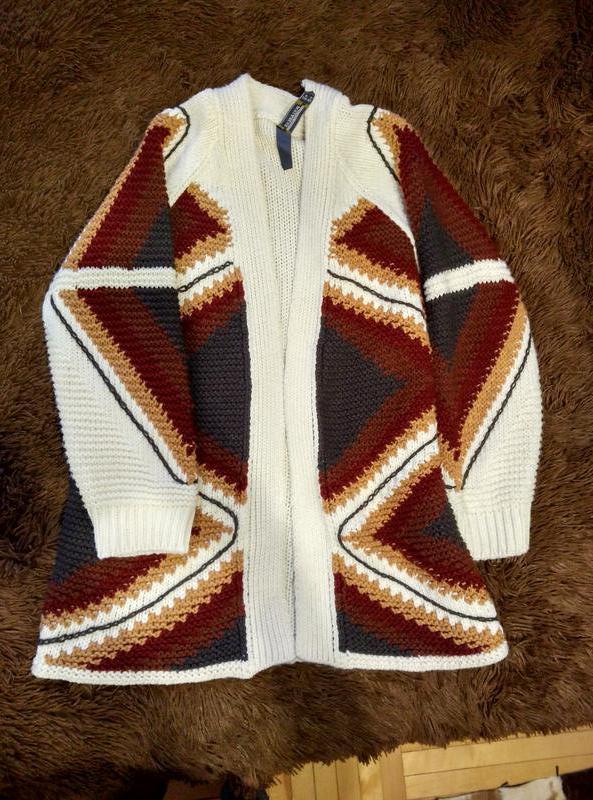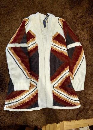 Очень теплая и невероятно удобная накидочка от известного бренда! Без пуговок и застежек! Красивый орнамент из крупных нитей! Свободный крой. Как новая! Размер указан М, но подойдёт как универсал для любой полноты и роста)