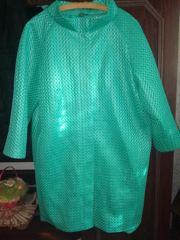 Яскравий кардиган. Ніжно зелений колір- трава. Рукав 3/4. На кнопках. Пог58. Довжина 95. На підкладці. Комірець стійкою.