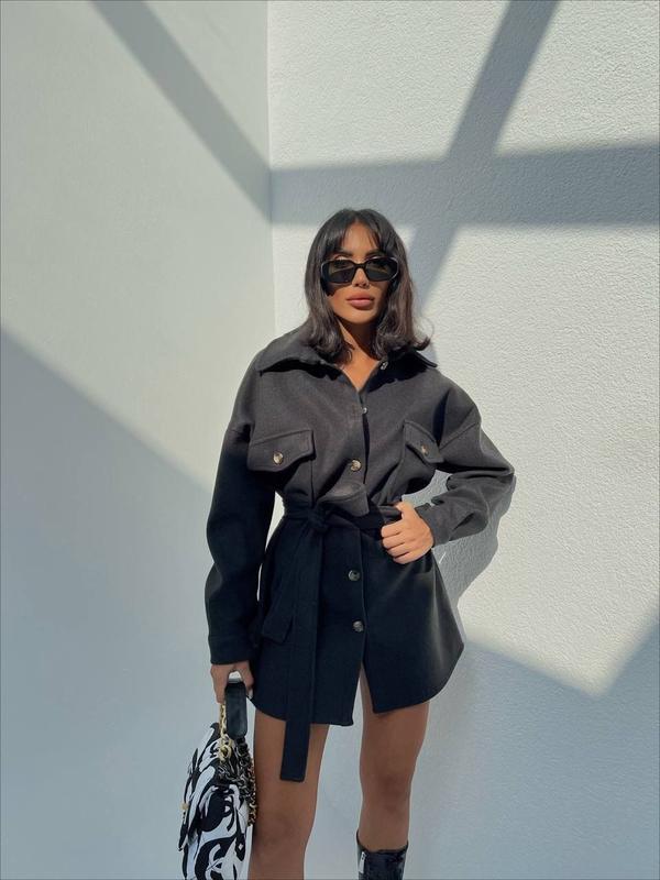 Размер:S(42-44) Цвет:черный Замеры по бирке: грудь-84-88 талия-62-66 бедра-90-94 Модель выполнена из пальтовой ткани, без подкладки, застегивается на пуговицы, с накладными карманами, которые также застегиваются. Рубашка с длинными рукавами, в талии шлевки, благодаря которым фиксируется и держится пояс Дефектов нет Товар новый