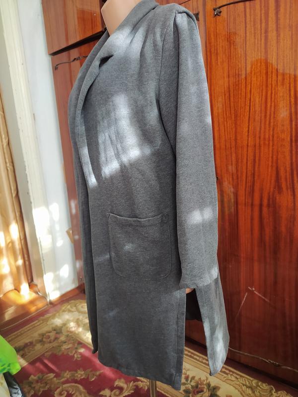 Теплый трикотажный кардиган на подкладке. Материал: 50% коттон, 50% полиэстер, подкладка полиэстер. Замеры: ширина в плечах 41см, пог 51см, пост 50см, длина 90см, рукав 56см.