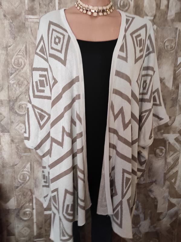 красивый ,освежающий кардиган, накидка хорошо на черный гольф, свитерок, тунику ПО изделия 98см, хотя указан маленький размер длина 68см плечо-рукав 46см, по рукава внизу 25см состав вискоза полиєстер