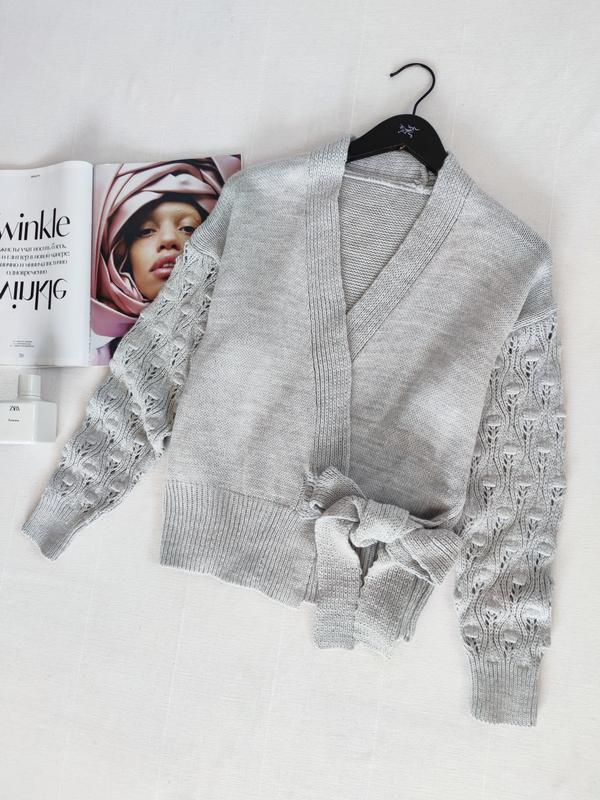 🌿сірий кардиган на запах з красивими рукавами Розмір:S Заміри:ПО грудей 50 см, довжина 56 см, довжина рукава від горловини 70 см Склад:акрил