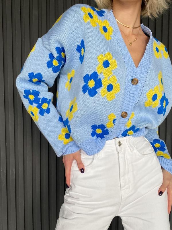 Арт 488 Кофта РОМАШКА 🇺🇦 Неймовірно стильна, та символічна кофта оверсайз, з принтом яскравих квітів Розмір : one size 42-48 Виповнена з акрилу Застібається ґудзиками по переду 1560 грн