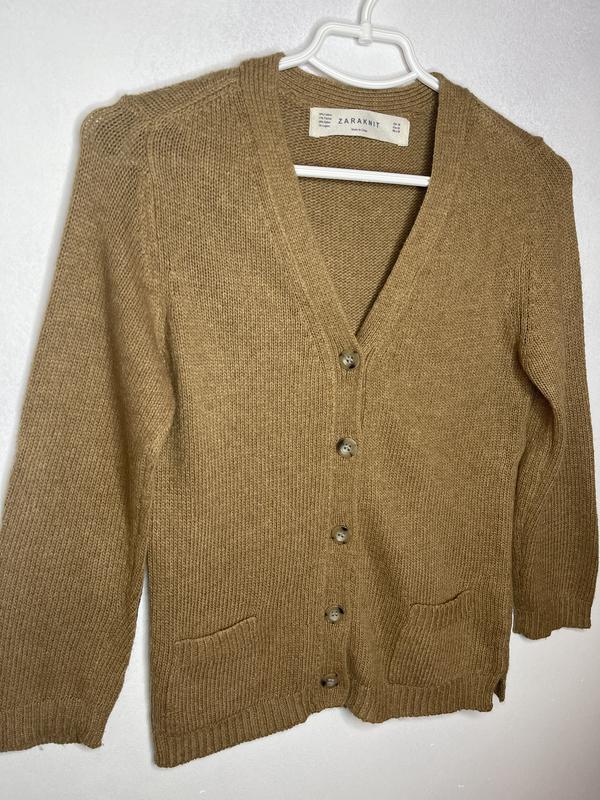бежевый кардиган бренда Zara. Размер М. Состояние идеальное, рукав 3/4, на локтях замшевые нашивки. Длина рукава 53 см Длина 58 см Ширина 39 см