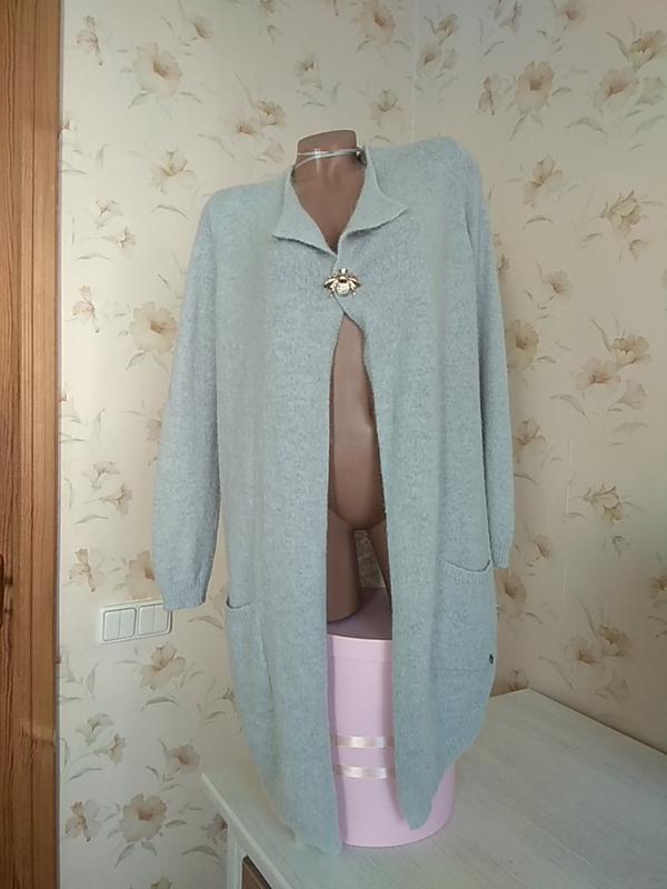 Оригинальный брендовый кардиган без пуговиц нежного серовато-голубого цвета. Спереди немного удлиненный, два кармана. Теплый, пушистый, "не кусается". Очень качественный состав- не растягивается и не линяет. В составе акрил,нейлон и шерсть ламы. Состояние идеальное. Дефектов нет.