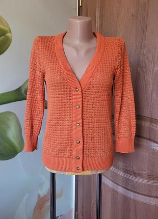 🧡Дуже акцентний кардиган/кофточка 🧡Помаранчевий колір,гарна вязка 🧡Стан відмінний, якість висока Плечі 36 см ПОГ 44 см Рукав 46 см Довжина виробу 53 см
