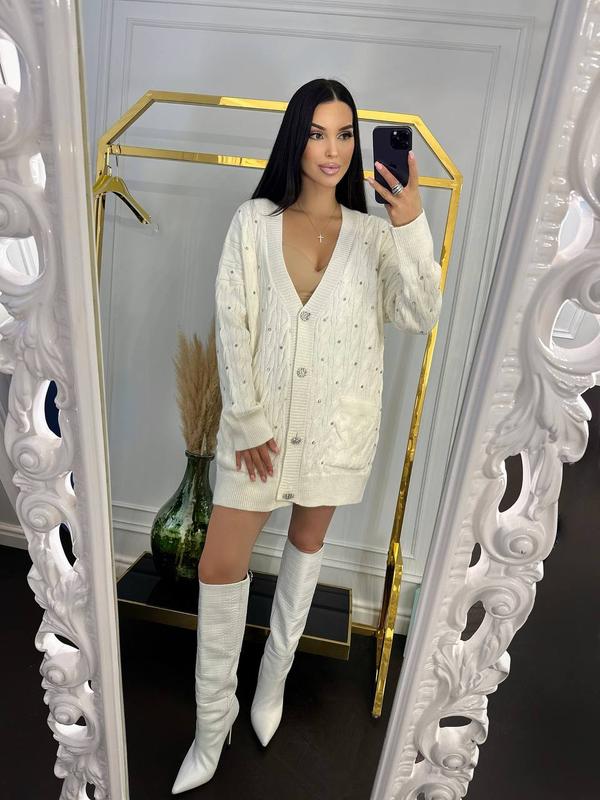 Кардиган з камінцями (артикул п648) ✅щільна в‘язка (кашемір - 50%, вовна 43%, віскоза 7%) ✅заміри вироба - довжина по спинці 75 см, напівобхват по грудях 64 см, довжина рукава від горловини 72 см ✅розмір єдиний 42-46 ✅кольори - молоко, зелений, бежевий, чорний