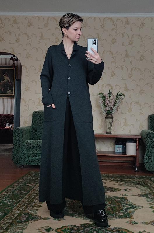 Довгий, напів вовняний кардиган сірого кольору. Спереди застібається на три гудзики. Є дві глибокі кишені спереду. Трикотаж важкий, середньої щільності. На фото одягнуто на параметри 88-70-95см, зміст 165-167см. Стан відмінний 👌 Розмір вказаний L, але добре підійде і на менший. Довжина 134см Плечі 42см Рукав 62см від плечового шву Ног 51см Нот 49-50см Ноб 51см Тканина тягнеться