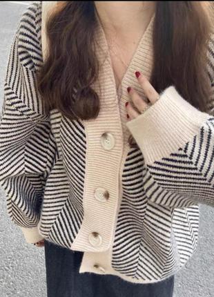 Теплий кардиган білого кольору в принт. З V-образним вирізом, не колючий. Прекрасний додатковий шар у холодну погоду і акцентна деталь у образах