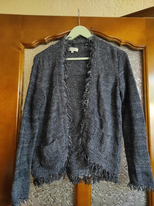 Пог 45 см, хорошо тянется,замеры в спокойном состоянии длина 63 см, рукав от плеча 60 см, дает два кармана с люрексовой ниточкой,сине серого цвета состояние идеально