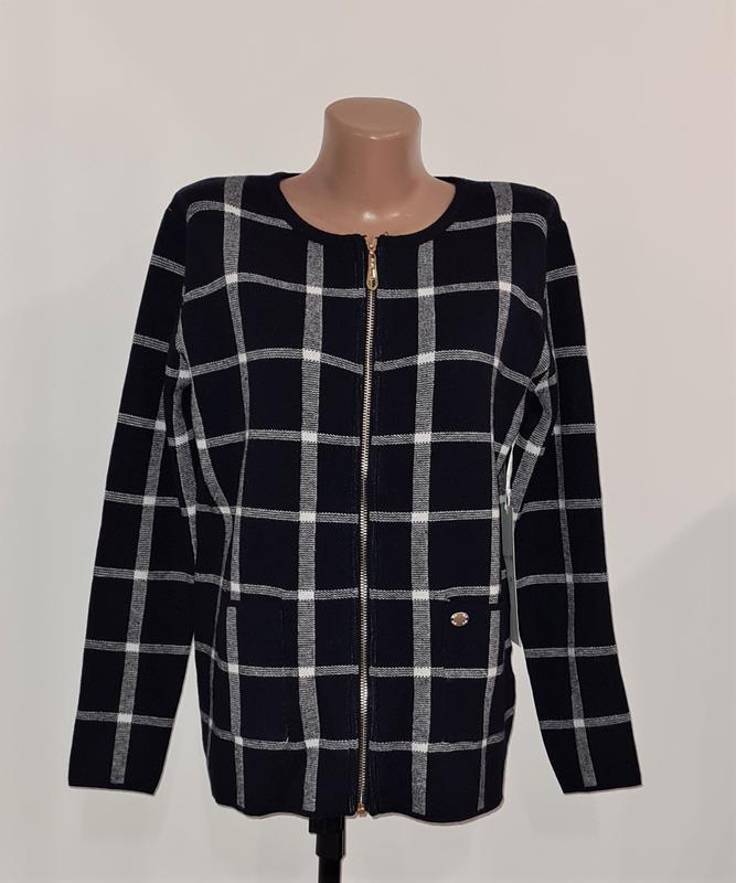 Очень красивая кофточка в клеточку на молнии. Цвет темно-синий, клеточки белые. Есть два карманчика. Размер S-M (полномерный, 48-52р.): объем по груди 102 см, объем по низу 100 см, плечо спущенное 11.5 см, рукав 55.5 см, длина по спине 60 см. Состав: 75% шерсть, 10% кашемир, 15% эластан.