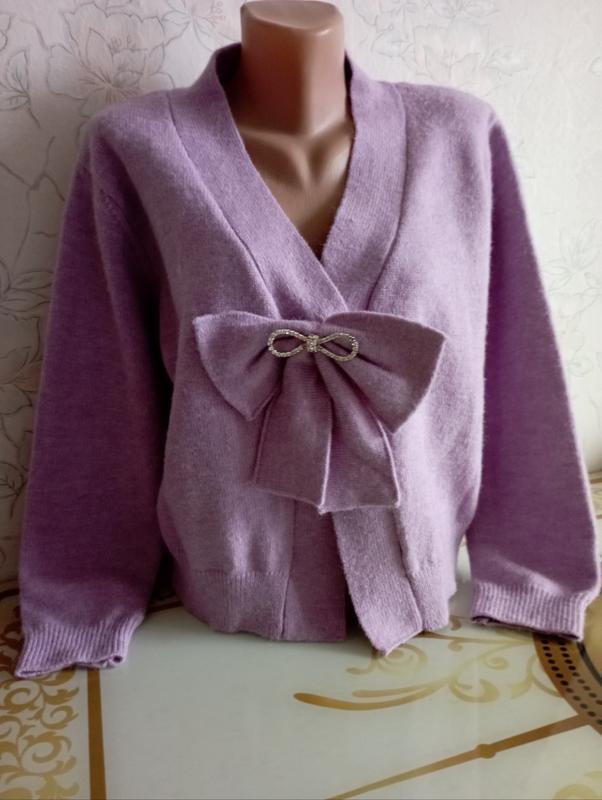 Очень красивый кардиган нежно- сиреневого цвета, плечи спущенные 44, ПІГ 56, ПИТ 50, рукав 55, длина изделия 50.