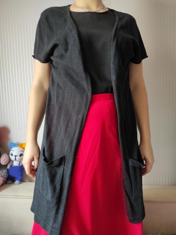 Кардиган черного цвета, размер 18, наш 54. Длина 70, длина рукава 66, плечи 45-48, ПОГ 55-60, ПИТ 50-55, ПОБОДЫ 50-60, низ 50-60. Состояние хорошее, но отсутствуют снизу пуговицы.